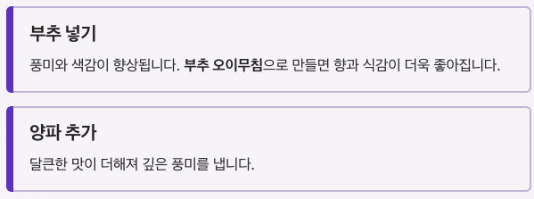 | 고추장 | 1/2큰술 | 감칠맛 |