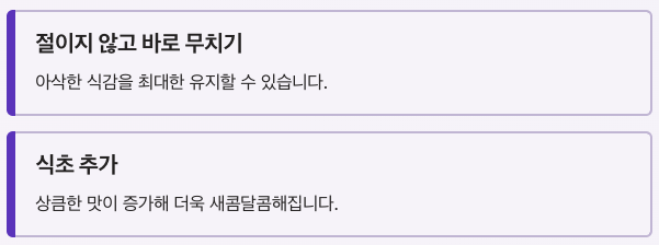 | 식초 추가 | 상큼한 맛 증가 |