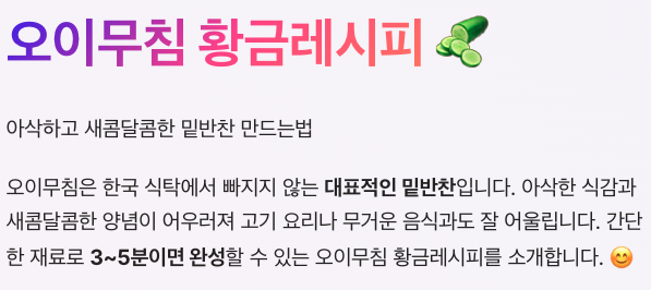 특히 간단한 재료로 3~5분이면 완성할 수 있어 집에서 쉽게 만들 수 있는 반찬이기도 합니다. 오늘은 아삭하고 물기 없이 맛있는 오이무침 황금레시피를 소개해 드리겠습니다. 😊