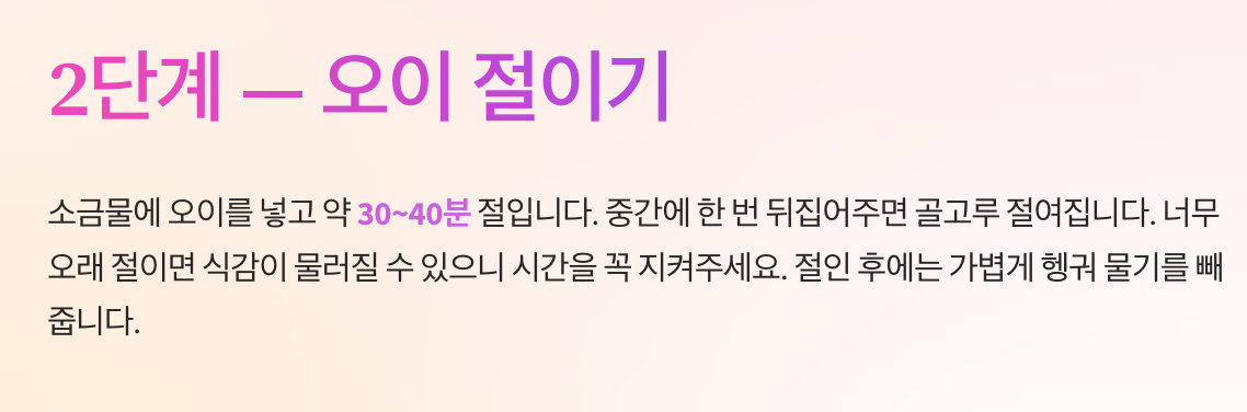 - 오이를 오래 절이면 식감이 물러짐