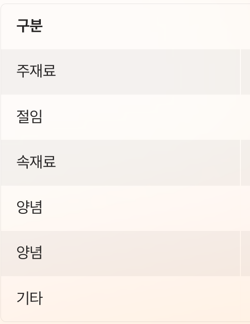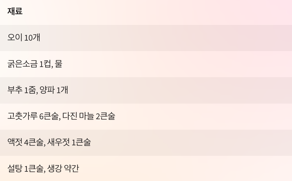 | 양념 | 고춧가루, 액젓, 마늘 |