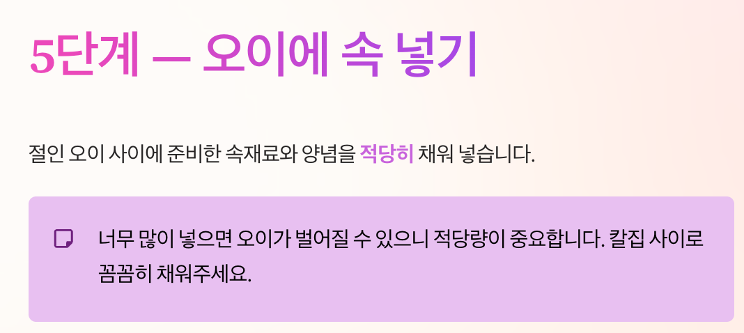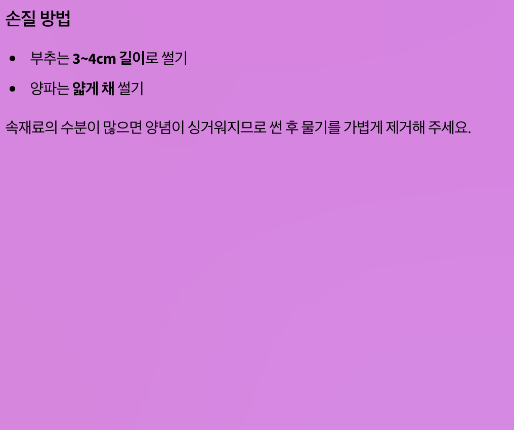 - 속재료 수분이 많으면 싱거워짐