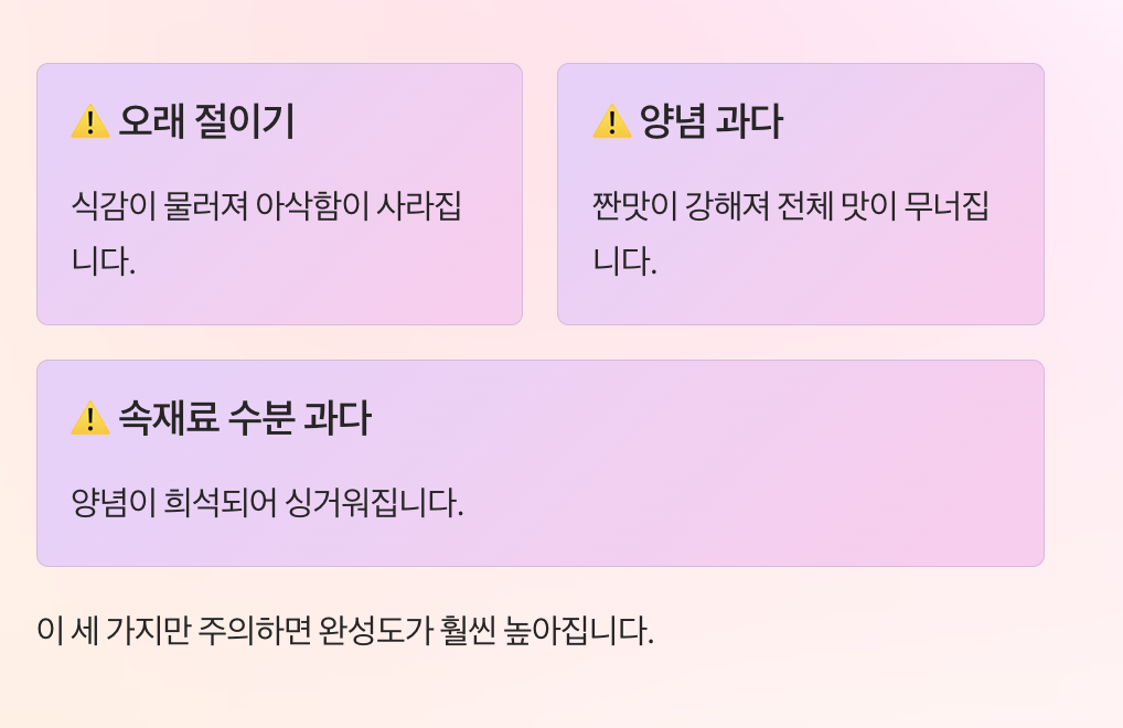 이 세 가지만 지키면 아삭하고 맛있는 오이소박이를 만들 수 있습니다.