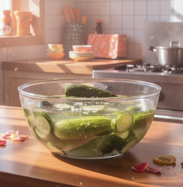 소금물에 오이를 넣고 약 30~40분 절입니다. 중간에 한 번 뒤집어주면 골고루 절여집니다. 너무 오래 절이면 식감이 물러질 수 있으니 시간을 지켜주세요. 절인 후에는 가볍게 헹궈 물기를 빼줍니다.