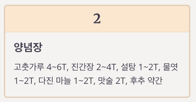 양념장 고춧가루 4~6T, 진간장 2~4T, 설탕 1~2T, 물엿 1~2T, 다진 마늘 1~2T, 맛술 2T, 후추 약간
