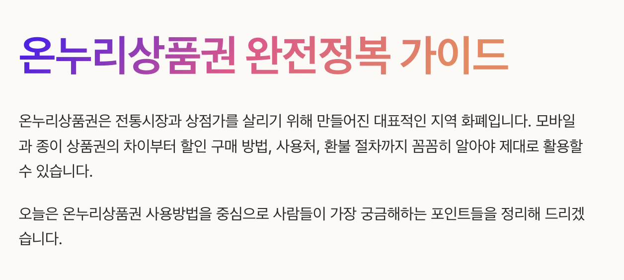 온누리상품권은 전통시장과 상점가를 살리기 위해 만들어진 대표적인 지역 화폐입니다. 하지만 모바일과 종이 상품권의 차이, 할인 구매 방법, 어디서 쓸 수 있는지, 그리고 잔액 환불 절차까지 꼼꼼히 알지 못하면 제대로 활용하기 어렵습니다. 오늘은 온누리상품권 사용방법을 중심으로 사람들이 가장 궁금해하는 포인트를 정리해 드리겠습니다.