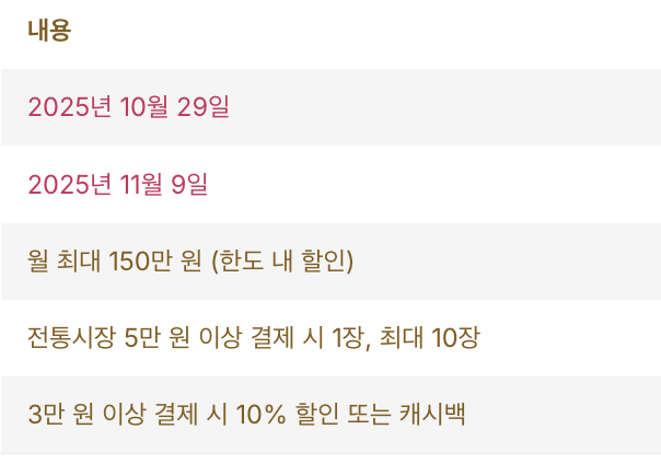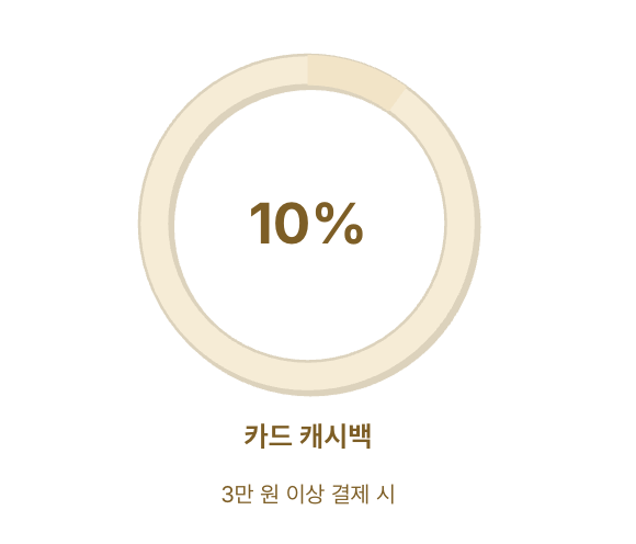 | 카드사 혜택 | 3만 원 이상 결제 시 10% 할인 또는 캐시백 |