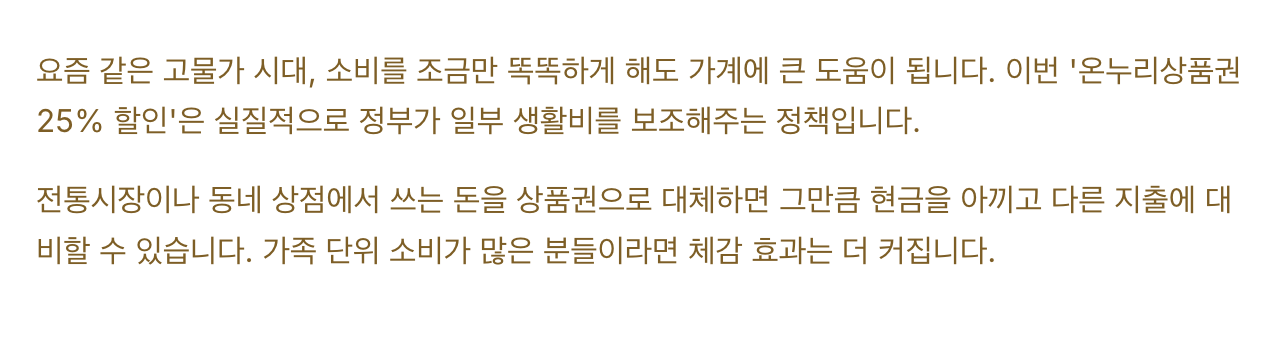 이번 ‘온누리상품권 25% 할인’은 실질적으로 정부가 일부 생활비를 보조해 주는 정책입니다.