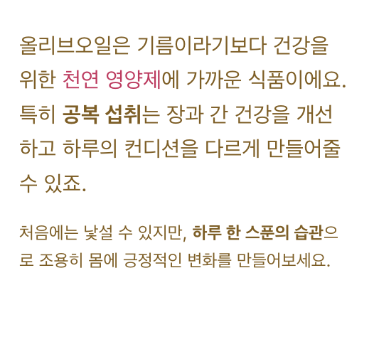 특히 고급 엑스트라버진 올리브오일은 그 자체만으로도 항산화 성분과 건강한 지방을 함유하고 있어, 공복에 먹는 방식으로 더욱 효과적으로 흡수된다고 알려져 있어요.