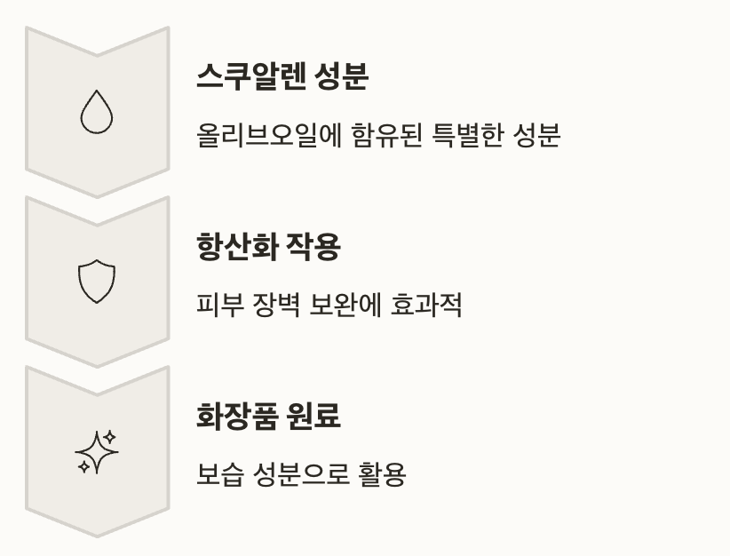 올리브오일에는 ‘스쿠알렌’이라는 성분도 들어 있습니다. 항산화 작용과 피부 장벽 보완에 좋다고 알려져 있죠.