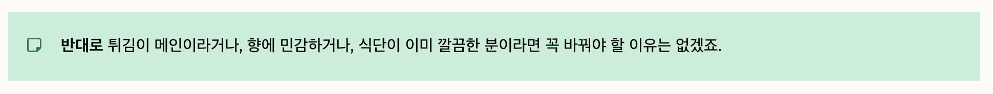 반대로 튀김이 메인이라거나, 향에 민감하거나, 식단이 이미 깔끔한 분이라면 꼭 바꿔야 할 이유는 없겠죠.