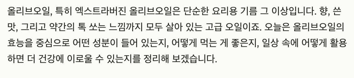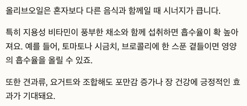 올리브오일도 결국 지방입니다. 아무리 좋은 성분이라도 많이 먹으면 칼로리 부담이 생길 수 있어요.
