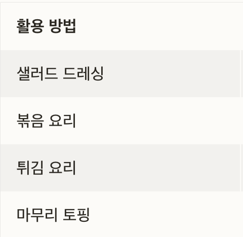 | 샐러드 드레싱 | 엑스트라버진 | 생으로 섭취 권장 |