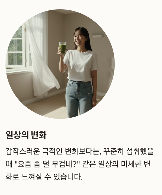 갑작스러운 극적인 변화보다는, 꾸준히 섭취했을 때 “요즘 좀 덜 무겁네?” 같은 일상의 미세한 변화로 느껴질 수 있습니다.