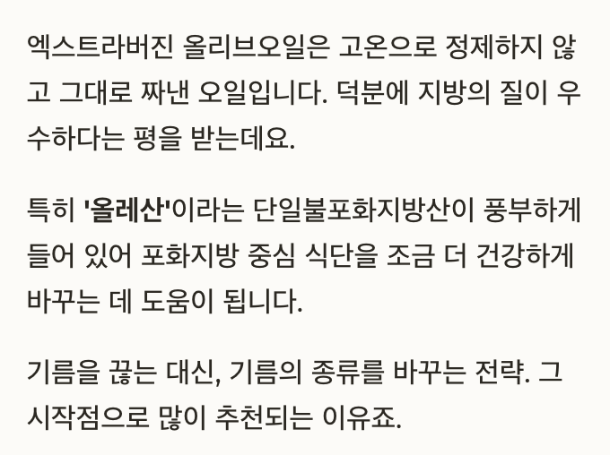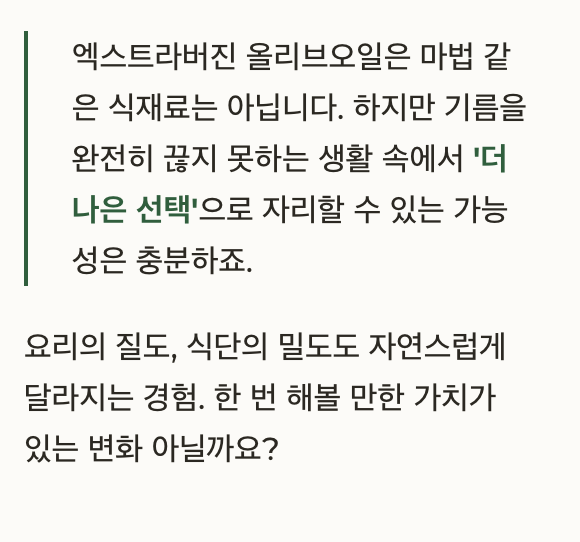이런 분들에겐 엑스트라버진 올리브오일이 훌륭한 시작점이 될 수 있어요.
