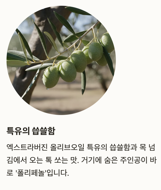 엑스트라버진 올리브오일 특유의 씁쓸함과 목 넘김에서 오는 톡 쏘는 맛. 거기에 숨은 주인공이 바로 '폴리페놀'입니다.