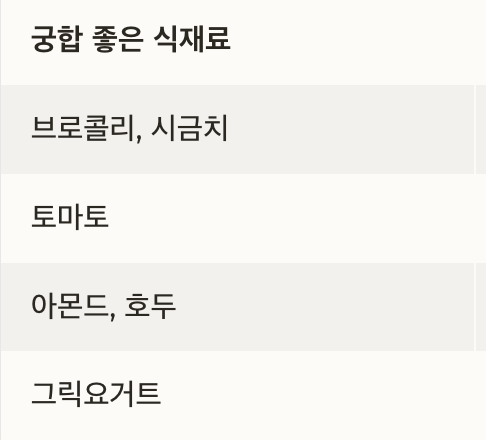 | 브로콜리, 시금치 | 비타민 흡수 증가 | 나물 무침, 찜 채소 마무리용 |