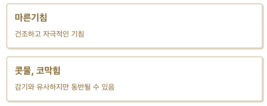 | 기침 | 마른기침 | 잦은 재채기와 함께 나옴 | 마른기침 |