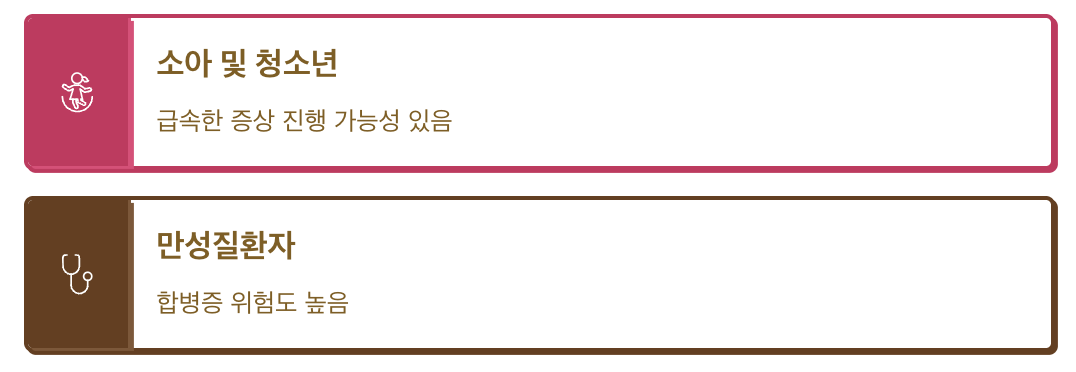 | 소아 및 청소년 | 급속한 증상 진행 가능성 있음 |