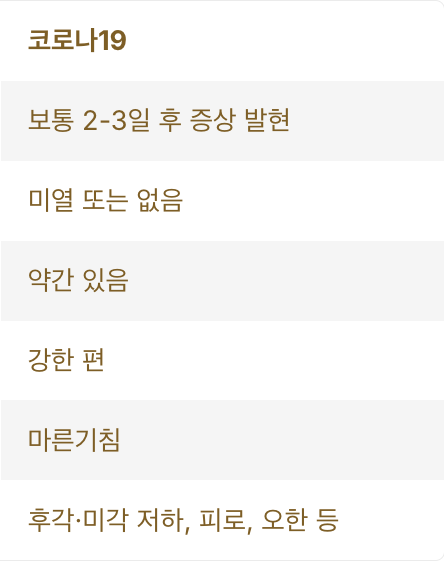 | 기타 증상 | 두통, 피로감, 식욕 저하 | 콧물, 코막힘, 눈물 | 후각·미각 저하, 피로, 오한 등 |