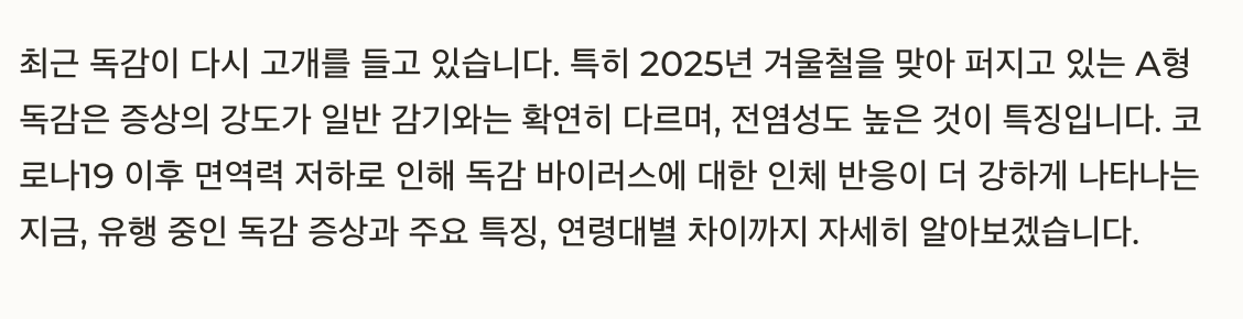 최근 독감이 다시 고개를 들고 있습니다. 특히 2025년 겨울철을 맞아 퍼지고 있는 A형 독감은 증상의 강도가 일반 감기와는 확연히 다르며, 전염성도 높은 것이 특징인데요. 코로나19 이후 면역력 저하로 인해 독감 바이러스에 대한 인체 반응이 더 강하게 나타나는 지금, 유행 중인 독감 증상과 주요 특징, 연령대별 차이까지 자세히 알아보겠습니다.