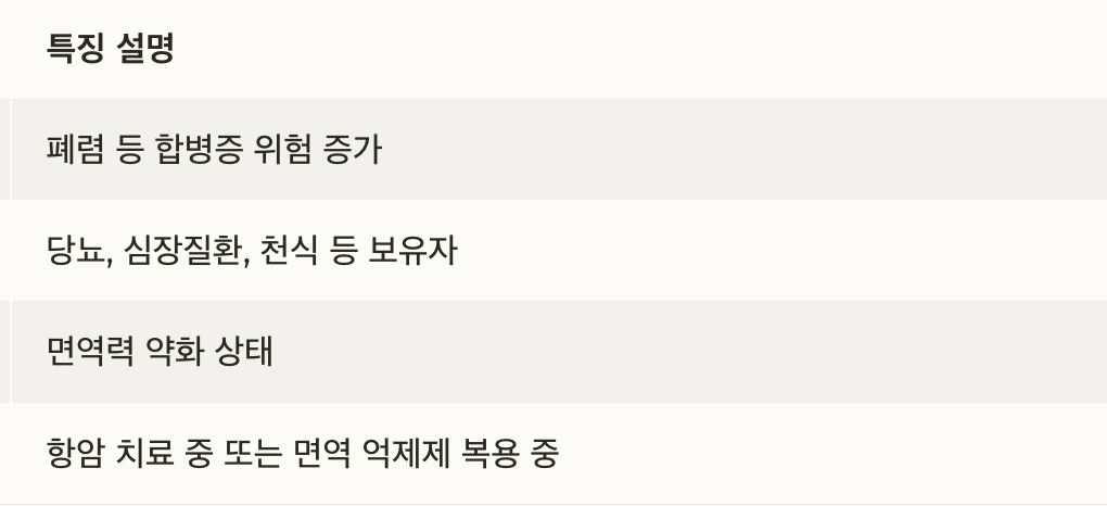 | 면역 저하자 | 항암 치료 중 또는 면역 억제제 복용 중 |