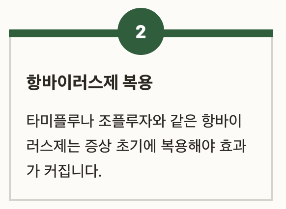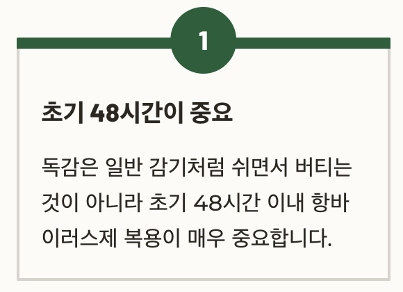 초기 48시간 이내 항바이러스제 복용이 매우 중요합니다.