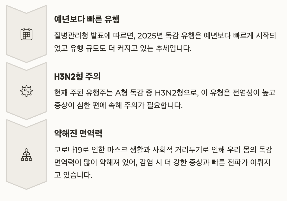2025년 독감 유행은 예년보다 빠르게 시작되었고, 유행 규모도 더 커지고 있는 추세입니다.