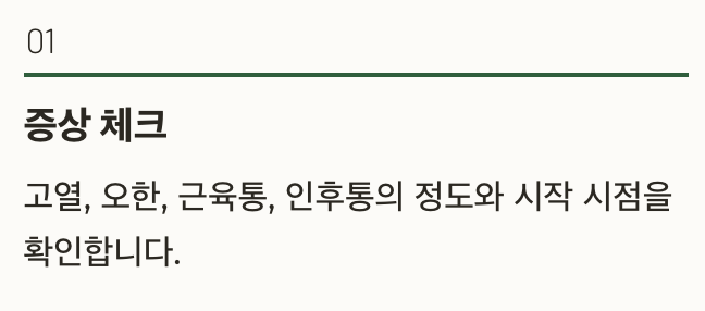 고열, 오한, 근육통, 인후통의 정도와 시작 시점, 독감 환자와의 접촉 여부를