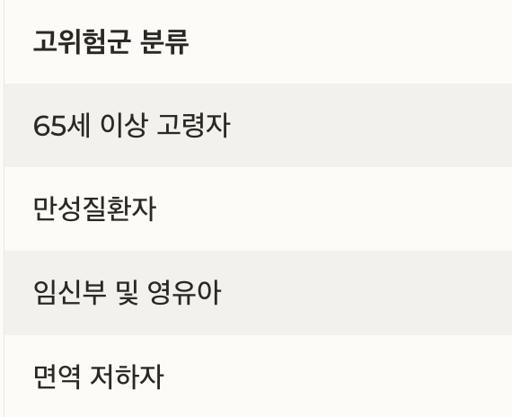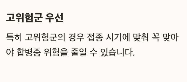 특히 고위험군의 경우 접종 시기에 맞춰 꼭 맞아야 합병증 위험을 줄일 수 있습니다.