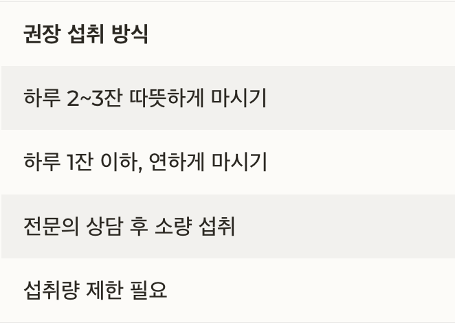 | 몸이 차고 마른 체질 | 하루 1잔 이하, 연하게 마시기 | 설사·복통 유의 |