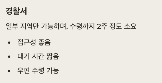 • 경찰서: 일부 지역만 가능하며, 수령까지 2주 정도 소요