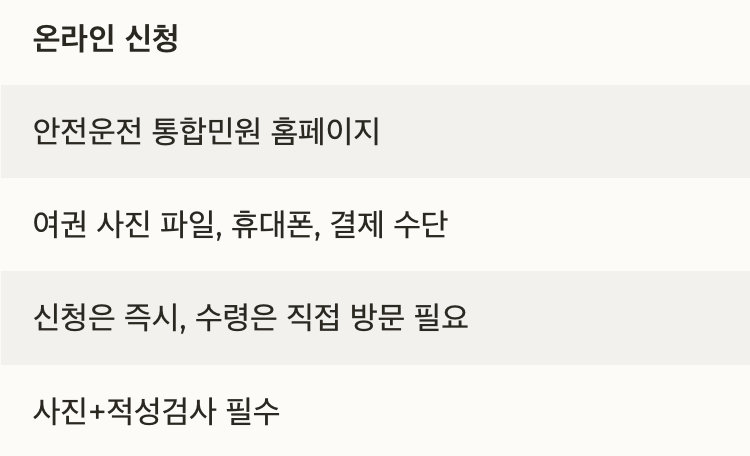 준비물 여권 사진 파일, 휴대폰, 결제 수단 실물 사진, 면허증, 수수료