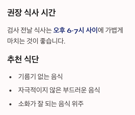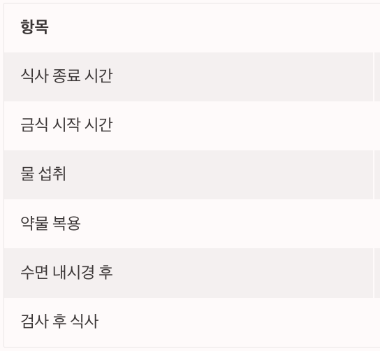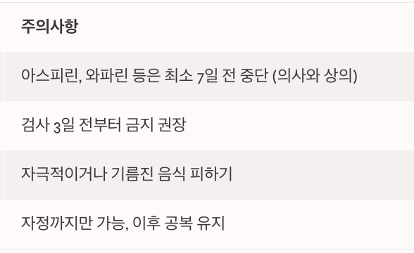 | 검사 후 식사 | 일반 검사: 1~2시간 뒤 / 시술 시: 당일 금식 |