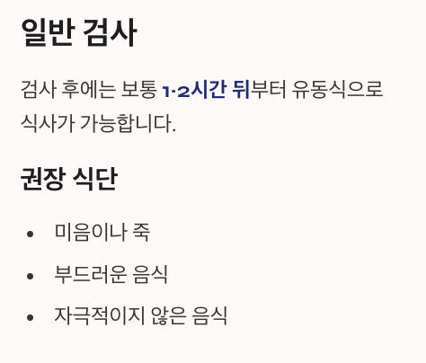 검사 후에는 보통 1~2시간 뒤부터 유동식으로 식사 가능하지만,