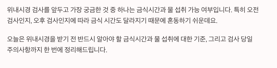 위내시경 검사를 앞두고 가장 궁금한 것 중 하나는 금식시간과 물 섭취 가능 여부입니다. 특히 오전 검사인지, 오후 검사인지에 따라 금식 시간도 달라지기 때문에 혼동하기 쉬운데요. 오늘은 위내시경을 받기 전 반드시 알아야 할 금식시간과 물 섭취에 대한 기준, 그리고 검사 당일 주의사항까지 한 번에 정리해드립니다.