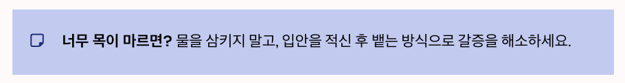 물을 삼키지 말고, 입안을 적신 후 뱉는 방식으로 갈증을 해소하세요.