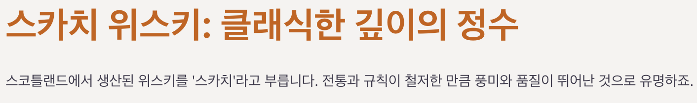 | 그레인 위스키 | 옥수수, 밀 등 | 대량 생산, 가볍고 부드러움 |