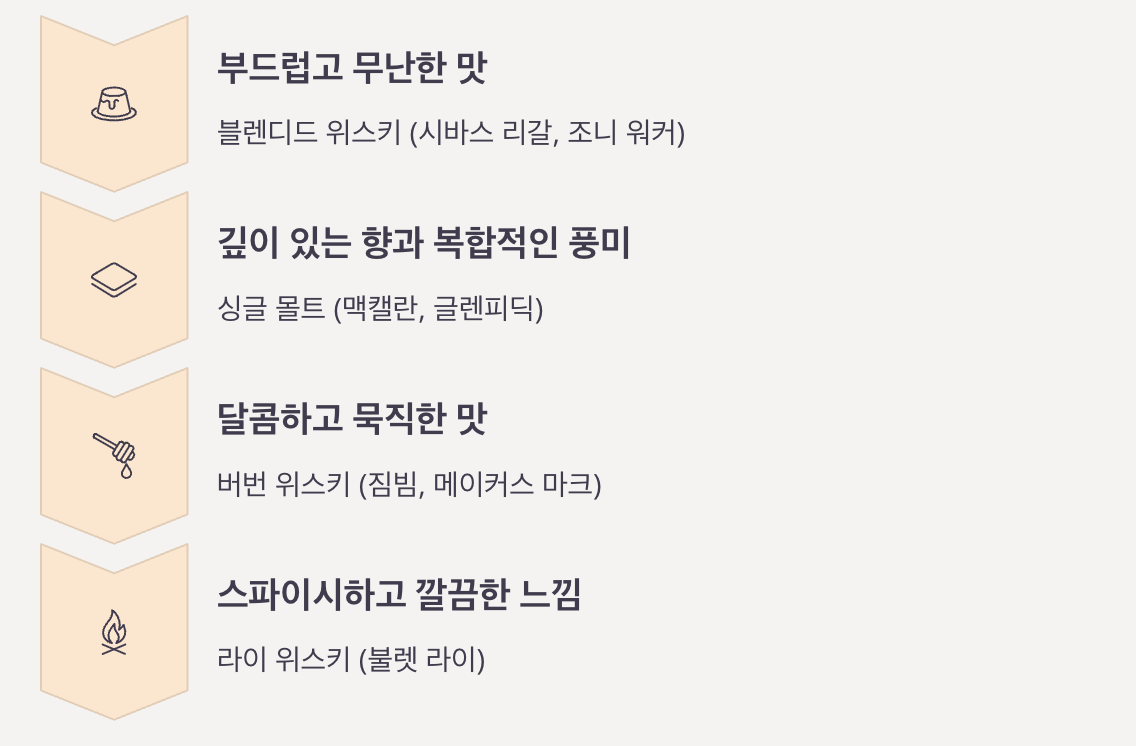 – 부드럽고 무난한 맛 → 블렌디드 위스키 (시바스 리갈, 조니 워커)
