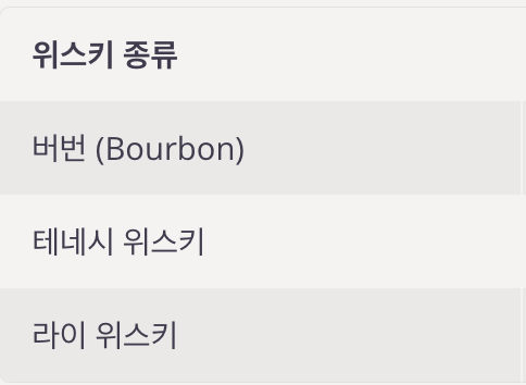 | 라이 위스키 | 호밀 51% 이상 | 스파이시하고 드라이한 맛 |