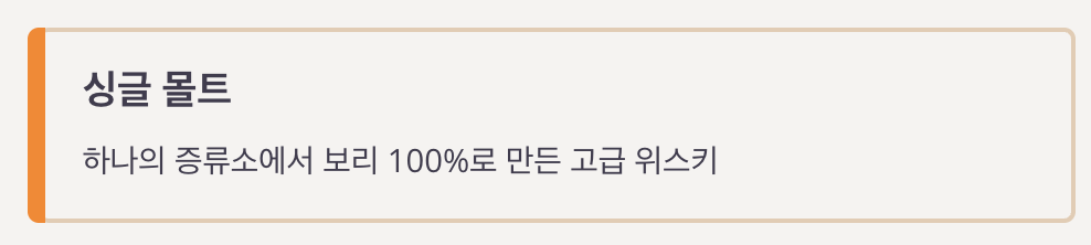 | 싱글 몰트 | 발아된 보리 100% | 한 증류소에서 생산, 복합적 향미 |