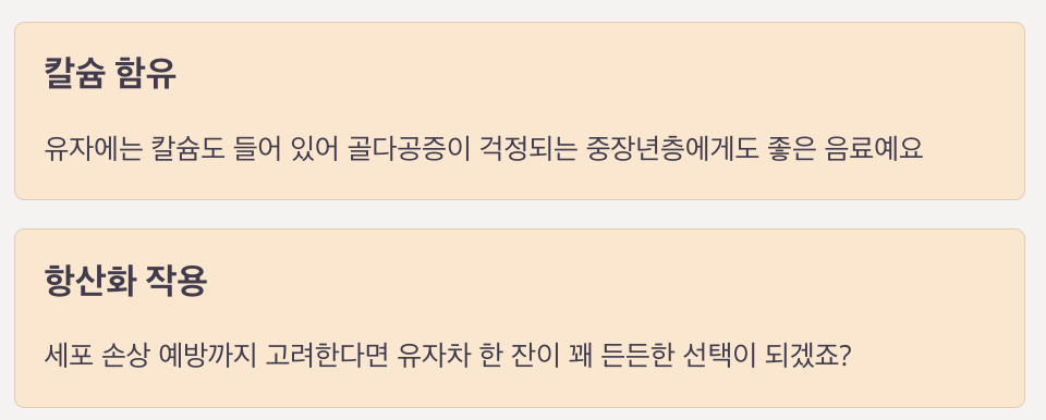 | 당 함량 주의 | 시판 제품은 당분이 높을 수 있어 과다 섭취 피하기 |