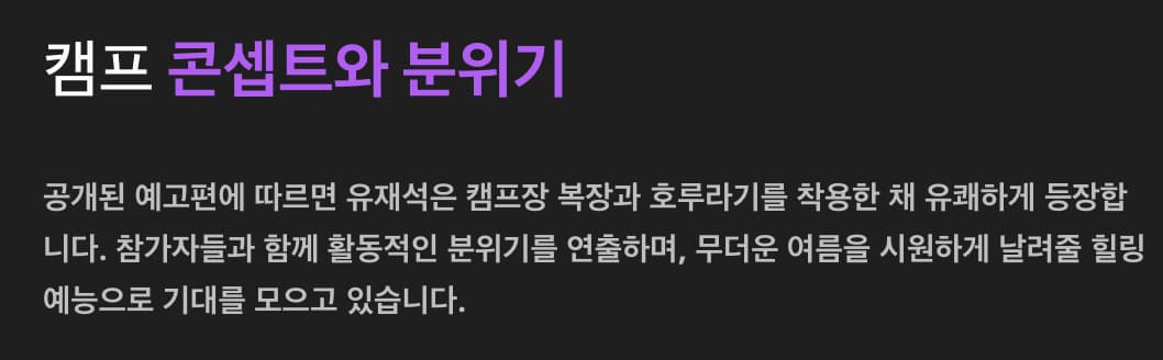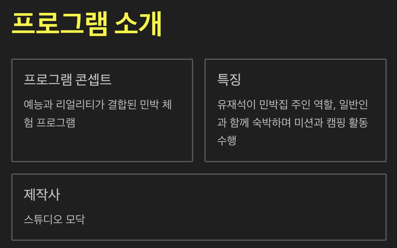 유재석 캠프는 예능과 리얼리티가 결합된 민박 체험 프로그램입니다.