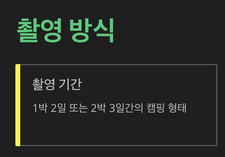1박 2일 또는 2박 3일간의 캠핑 형태로 촬영이 진행되며,