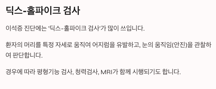 이석증 진단에는 '딕스-홀파이크 검사'가 많이 쓰입니다.