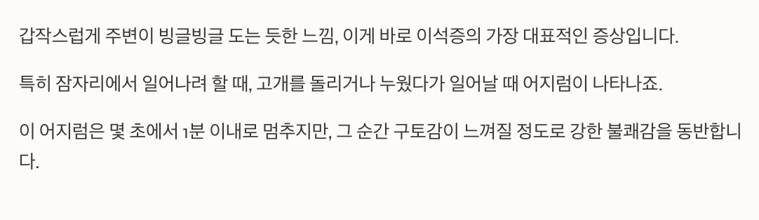 갑작스럽게 주변이 빙글빙글 도는 듯한 느낌, 이게 바로 이석증의 가장 대표적인 증상입니다.