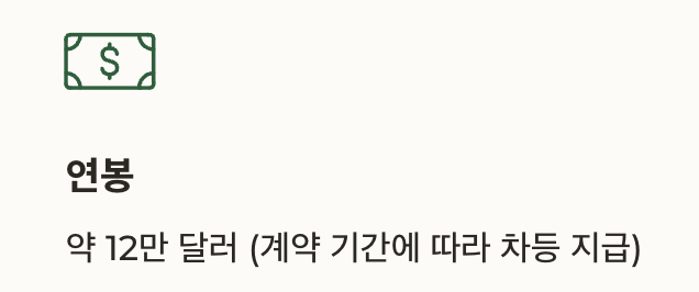 | 연봉 | 약 12만 달러 (계약 기간에 따라 차등 지급) |