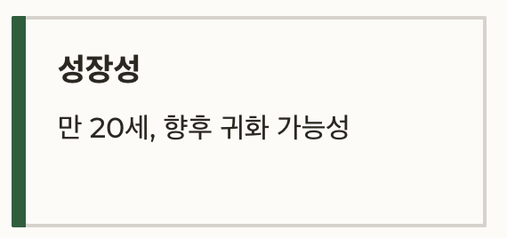 | 성장성 | 만 20세, 향후 귀화 가능성 |