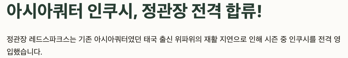 태국 출신 위파위의 재활 지연으로 인해 시즌 중 인쿠시를 전격 영입했습니다.