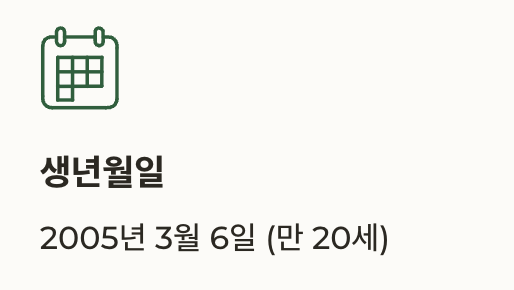 | 생년월일 | 2005년 3월 6일 (만 20세) |